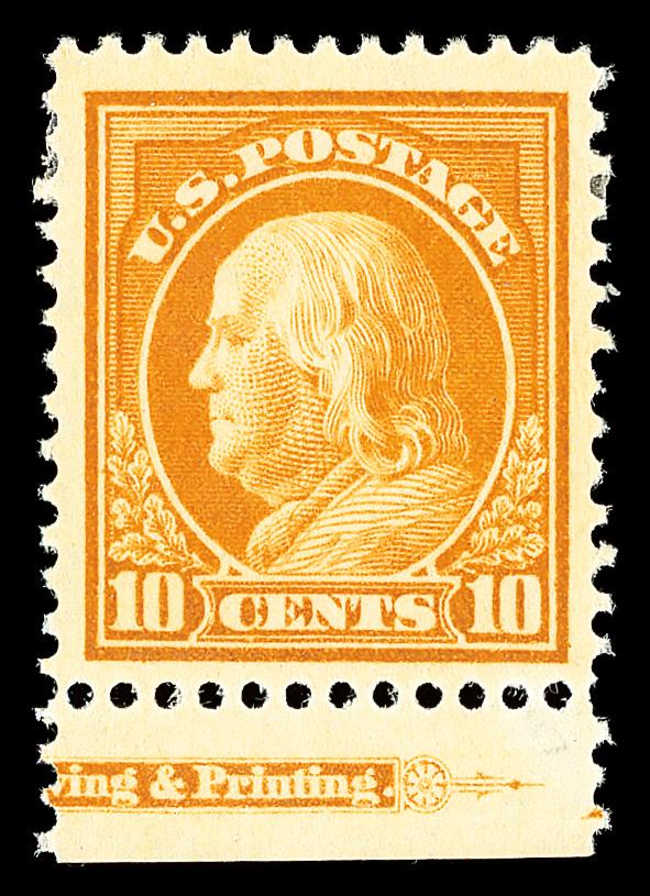 1912, 10¢ orange yellow, S.L. watermark, perf. 12 (Scott 416), bottom margin part imprint single, o.g., hinge remnant, pristine and sound with deep color, Very Fine to Extremely Fine, with 2025 Crowe certificate graded VF-XF 85 J. SMQ VF-XF 85J; $60. Scott $40. (Image)