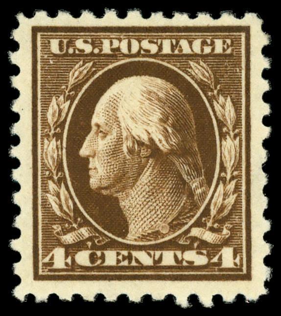 1914, 4¢ brown, S.L. watermark, perf. 10 (Scott 427), o.g., never hinged, Very Fine to Extremely Fine. Scott $75. (Image)