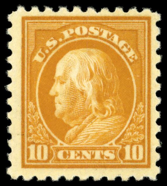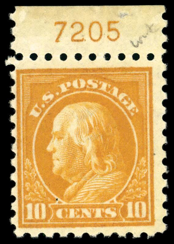 1914, 10¢ orange yellow, S.L. watermark, perf. 10 (Scott 433), plate number single, o.g., stamp never hinged, hinged in selvage only, Fine. Scott $100. (Image)