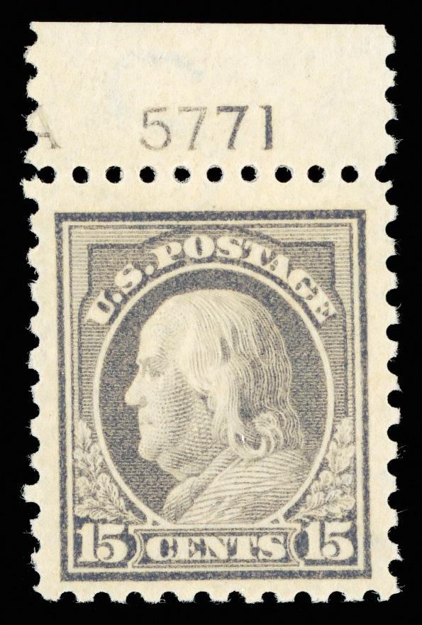 1914, 15¢ gray, S.L. watermark, perf 10 (Scott 437), top margin plate number A 5771 single, o.g., hinged, a premium plate number, fresh and bright; "MAY 3 '15" handstamp on reverse, nearly Very Fine. Scott $120. (Image)