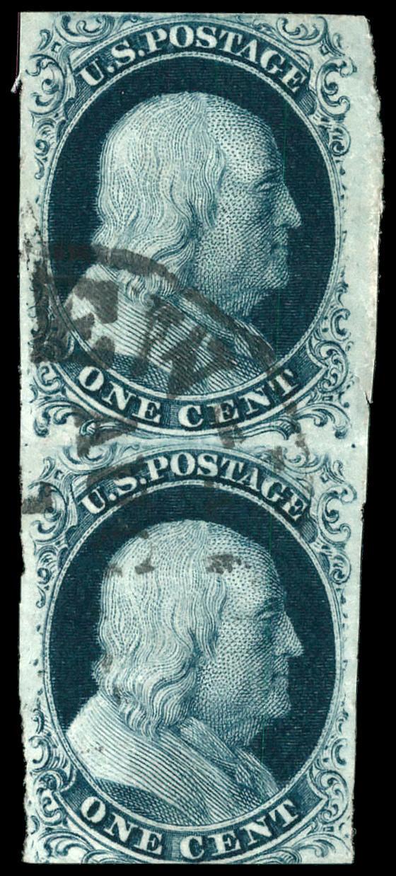 1851, 1¢ blue, type II (Scott 7), vertical pair, positions 21L2 & 31L2, town cancel; top stamp diagonal crease & closed margin tear, Fine, with 2024 P.F. certificate. Scott $325. (Image)