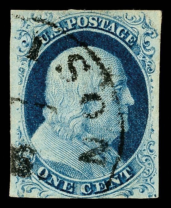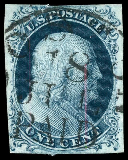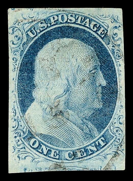1852, 1¢ blue, type IV (Scott 9), position 21R1L, with strong color and clear detail; margins just grazed at bottom to clear/full otherwise, Very Fine. Scott $100. (Image)