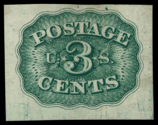 1851, 3¢ Numeral essay, by Bald, Cousland & Co., in blue green (Scott 11-E16a), die on India paper, cut small, without gum as issued, Very Fine to Extremely Fine. Brazer 33E-Na. Scott $275. (Image)