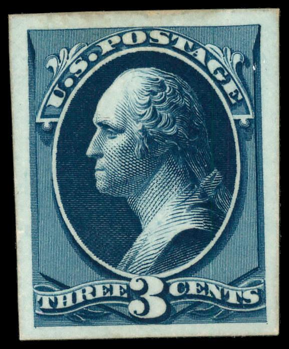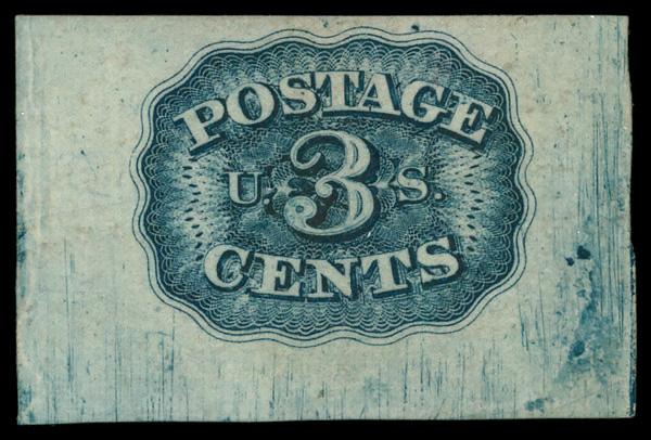 1851, 3¢ Numeral essay, by Bald, Cousland & Co., in blue (Scott 11-E16b), die on bond paper, without gum as issued, Very Fine to Extremely Fine. Brazer 33E-Nb. Scott $175. (Image)