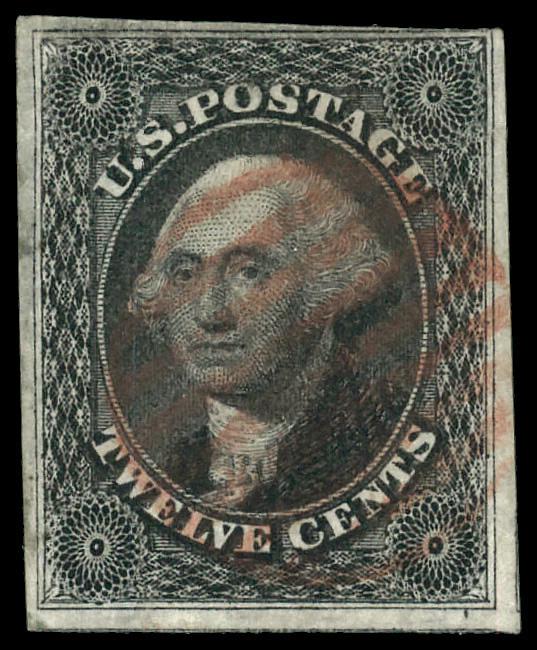 1851, 12¢ gray black (Scott 17), red grid cancel; small closed tear top right, Fine to Very Fine. Scott $290. (Image)