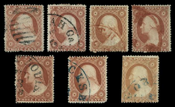 1857, 3¢ dull red, type IV (Scott 26A), sone red & some blue cds; all with various small faults, Very Good to Fine. Scott $1,040. (Image)