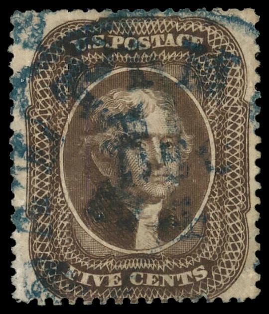 1860, 5¢ brown, type II (Scott 30A), blue cancel; reperfed at top, Very Good to Fine. Scott $425. (Image)