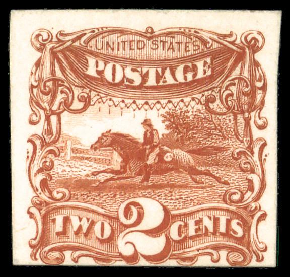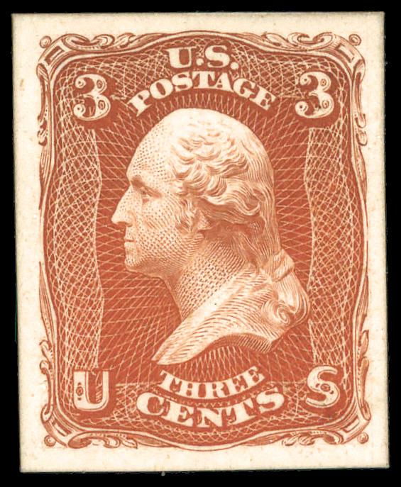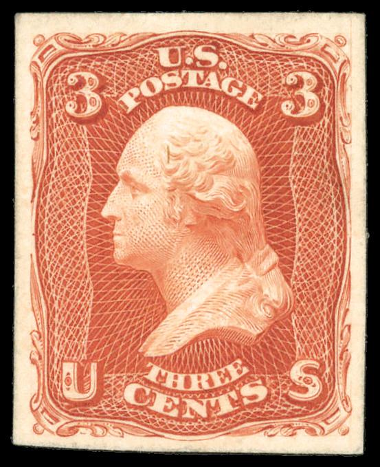 1861, 3¢ scarlet, trial color plate proof on card (Scott 74TC4), without gum as issued, Very Fine. Scott $150. (Image)