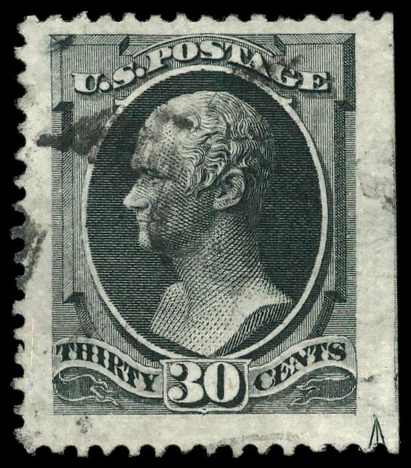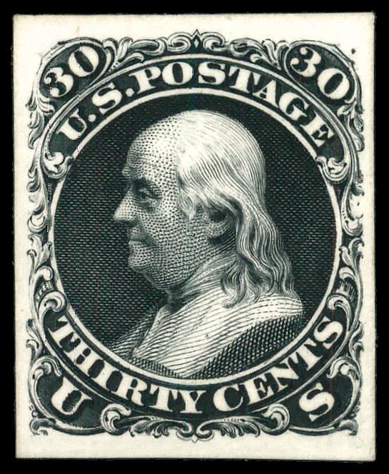 1861-66 (1875 Re-issue), 30¢ black, "Atlanta" trial color plate proof on card (Scott 110TC4a), without gum as issued, Very Fine. Scott $90. (Image)