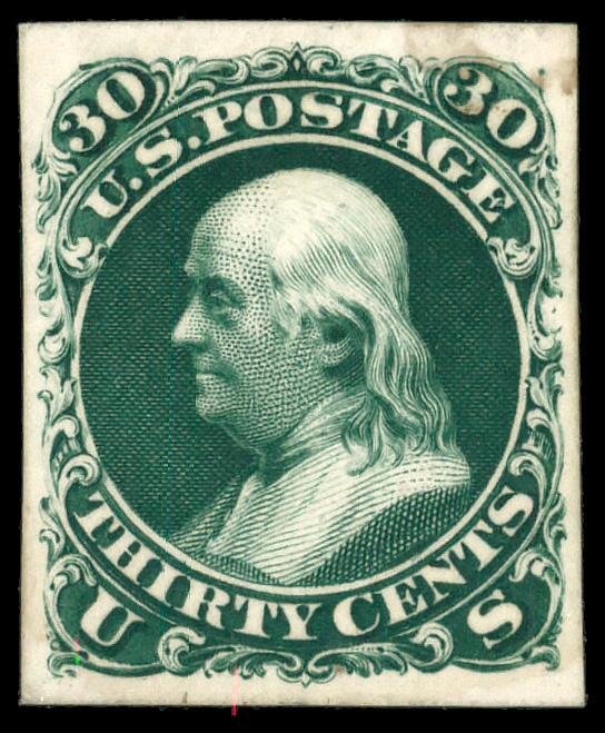 1861-66 (1875 Re-issue), 30¢ green, "Atlanta" trial color plate proof on card (Scott 110TC4d), without gum as issued, Very Fine. Scott $90. (Image)
