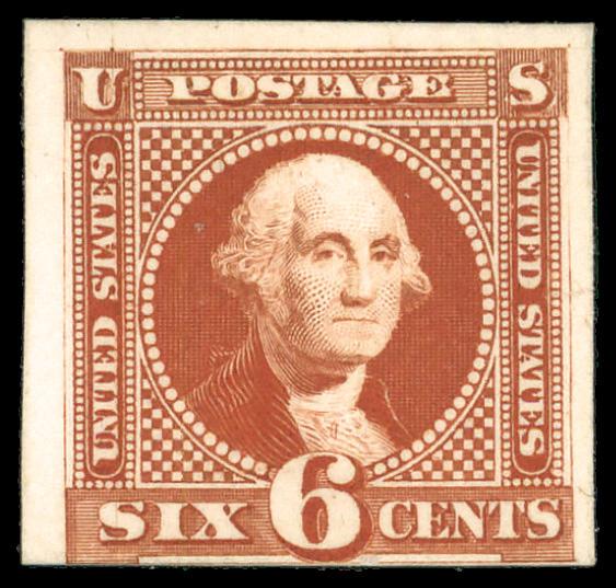 1861-66 (1875 Re-issue), 3¢ scarlet, "Atlanta" trial color plate proof on card (Scott 104TC4b), without gum as issued, Extremely Fine. Scott $90. (Image)