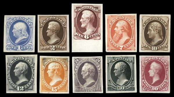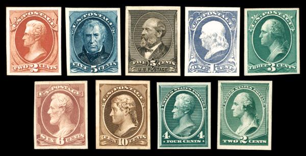 1879, 2¢ vermilion, 5¢ blue, 5¢ yellow brown, 1¢ blue, 3¢ blue green, 6¢ deep rose, 10¢ brown, 4¢ green & 2¢ green plate proof on card (Scott 183P4//213P4), without gum as issued, Very Fine. Scott $265. (Image)