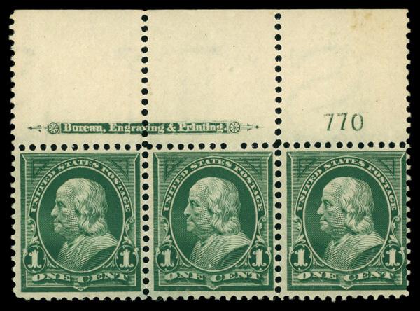 1898, 1¢ deep green (Scott 279), plate number strip of 3, o.g., never hinged, Fine to Very Fine. Scott $85. (Image)