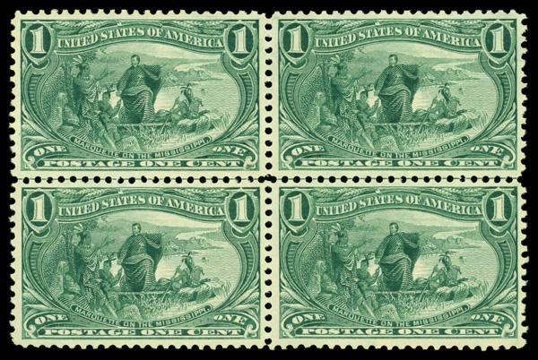 1898, 1¢ Trans-Miss. (Scott 285), block of 4, o.g., never hinged; light horizontal crease on top left stamp, Very Fine. Scott $300. (Image)