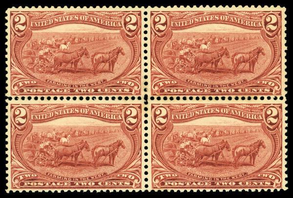 1898, 2¢ Trans-Miss. (Scott 286), block of 4, o.g., very lightly hinged; light fingerprint on the gum of one 2¢ stamp, Fine to Very Fine. Scott $110. (Image)