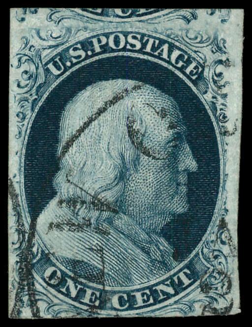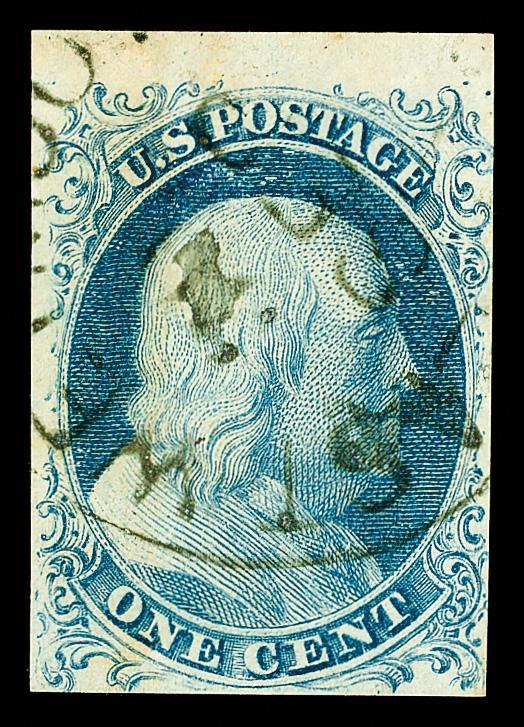 1852, 1¢ blue, type IV (Scott 9), position 8R1L, a lovely top margin example in captivating color; detail clear, paper fresh, cancel adding to the appeal; faint toned spot at bottom left, Very Fine nonetheless, with 2001 P.F. certificate. Scott $100. (Image)
