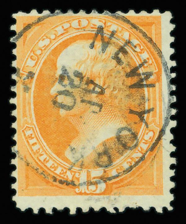 1873, 15¢ yellow orange, C.B.N.C. printing (Scott 163), New York cds, Fine. Scott $160. (Image)