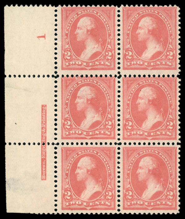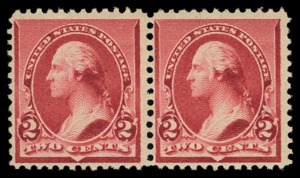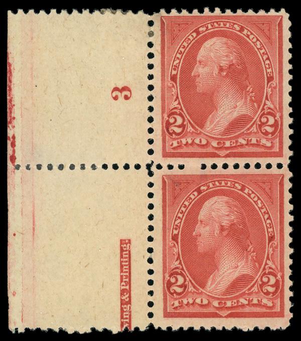 1894, 2¢ carmine, type I, unwatermarked (Scott 250), left margin pair with plate number and part imprint, o.g., hinge remnant at top, never hinged at bottom, Fine to Very Fine. Scott $115. (Image)