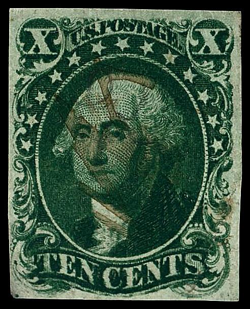 1855, 10¢ green, type I (Scott 13), manuscript cancel; a couple tiny thins and corner crease, Fine four full margins, just touching at left. Scott $375. (Image)