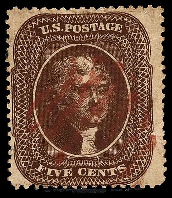 1860, 5¢ brown, type II (Scott 30A), red cancel; tiny hinge thin, Fine. Scott $450. (Image)