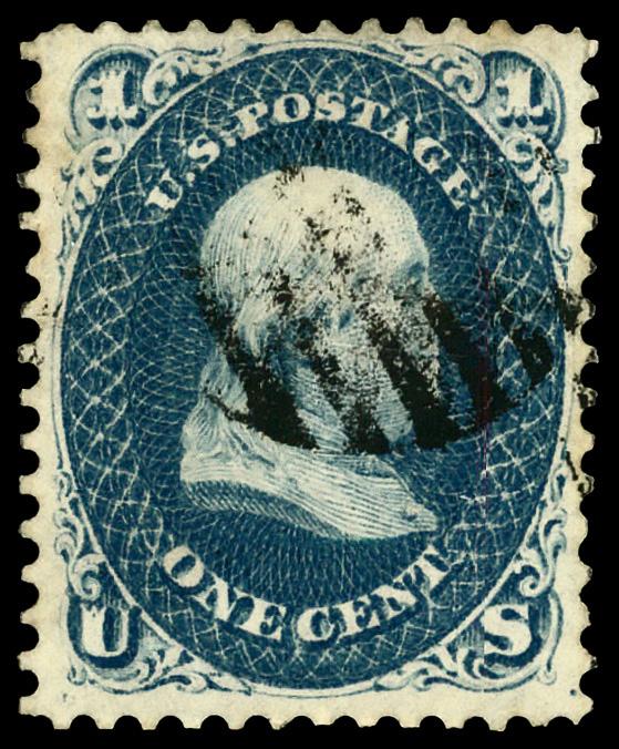 1867, 1¢ blue, F. grill (Scott 92), circle of wedges cancel; a couple small thins, Fine to Very Fine. Scott $450. (Image)