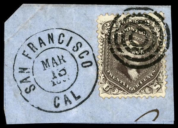 1862, 24¢ red lilac (Scott 70), tied to piece with target cancel; stamp with creases, Fine to Very Fine, with 2023 P.F. certificate. Scott $300. (Image)