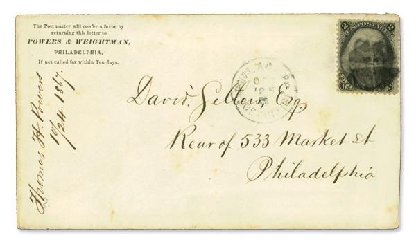 1863, 2¢ black (Scott 73), on small Philadelphia drop rate cover with "Powers & Weightman" corner card; light foxing and slightly reduced at right, Fine to Very Fine. Scott $85. (Image)