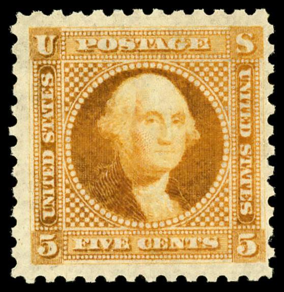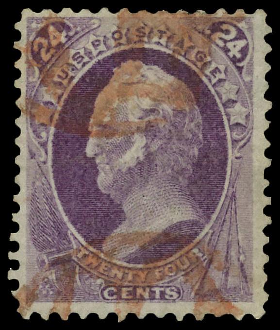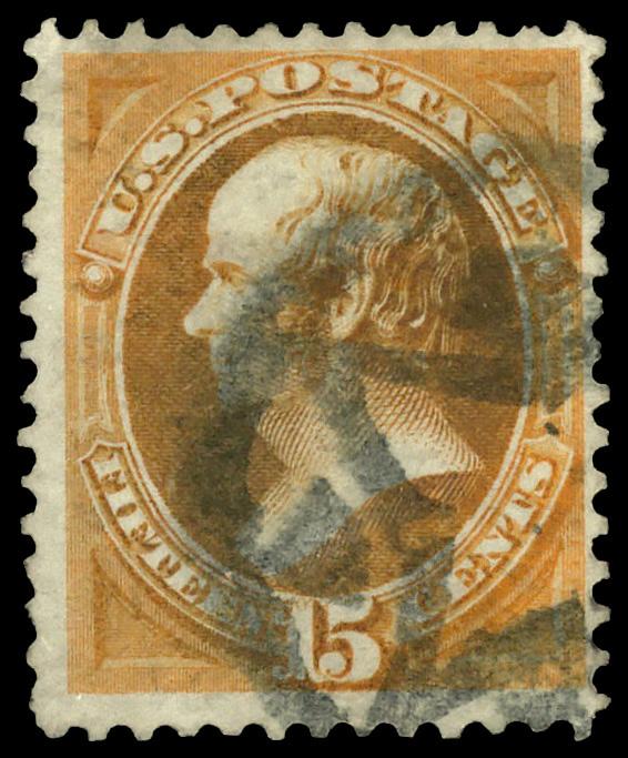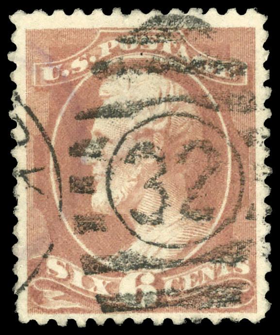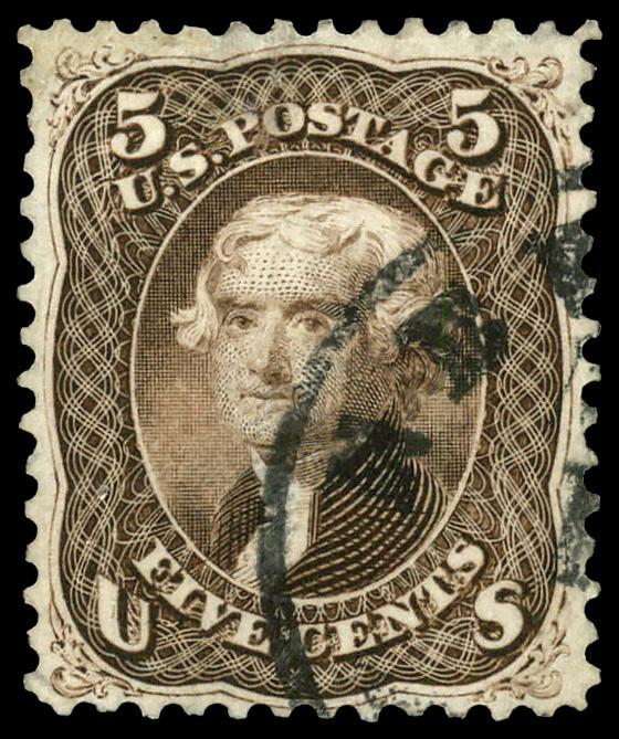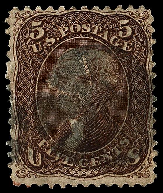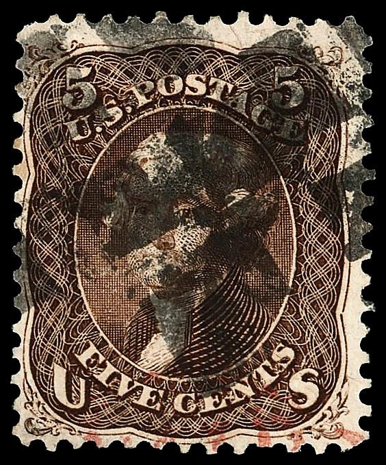 1867, 5¢ brown, F. grill (Scott 95); a few tiny faults, Very Good to Fine. Scott $900. (Image)