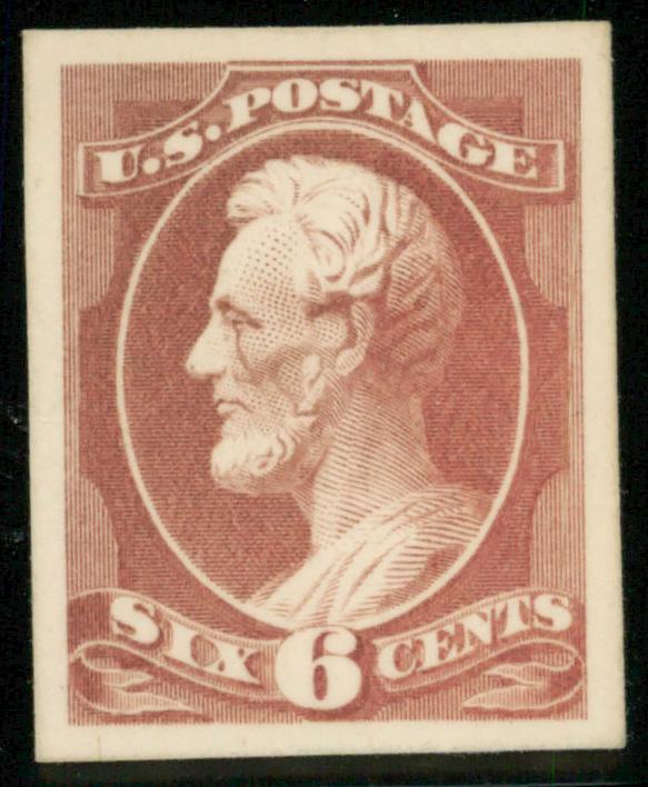 1882, 6¢ deep rose, plate proof on card (Scott 208P4), without gum as issued, Extremely Fine. Scott $60. (Image)