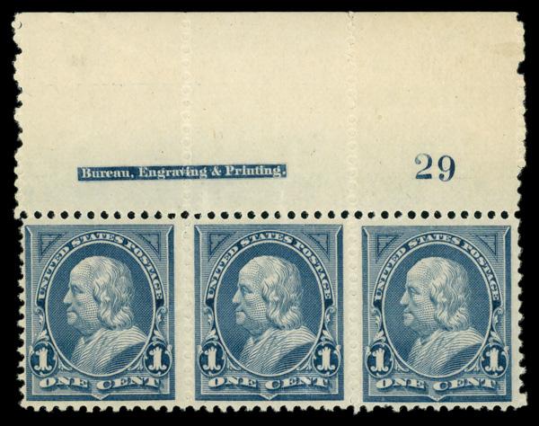 1894, 1¢ blue, unwatermarked (Scott 247), plate number strip of 3, o.g., never hinged, Fine to Very Fine. Scott $600. (Image)