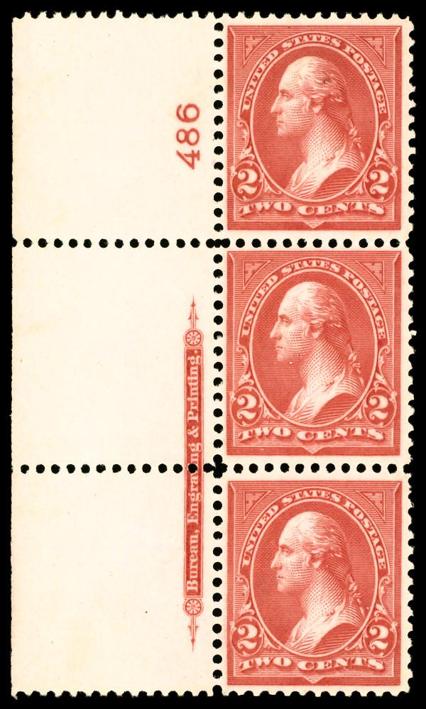 1895, 2¢ carmine, type III, D.L. watermark (Scott 267), left margin plate number strip of 3, o.g., never hinged; minor perf separation between top stamps, Very Fine, with 2021 P.S.E. certificate graded VF 80. Scott $58. (Image)