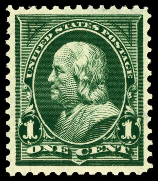 1898, 1¢ deep green (Scott 279), o.g., never hinged, Very Fine to Extremely Fine, with 2006 P.S.E. certificate graded VF-XF 85. SMQ VF-XF 85; $45. (Image)
