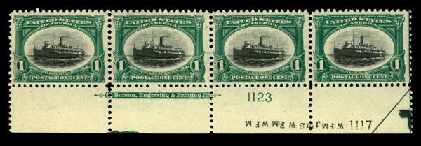 1901, 1¢ Pan-American (Scott 294), bottom margin plate number strip of 4, o.g., center stamps never hinged / others hinged; left stamp has thin, Fine to Very Fine. Scott $119. (Image)