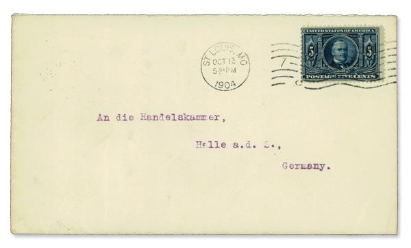 1904, 5¢ Louisiana Purchase (Scott 326), type addressed to Germany; opened neatly at top, Very Fine stamp is very good. (Image)