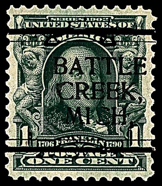 1903, 1¢ blue green (Scott 300), precancel 'BATTLE/CREEK/MICH.', Very Fine to Extremely Fine, with 2005 P.S.E. certificate graded VF-XF 85. SMQ VF-XF 85; $20. (Image)