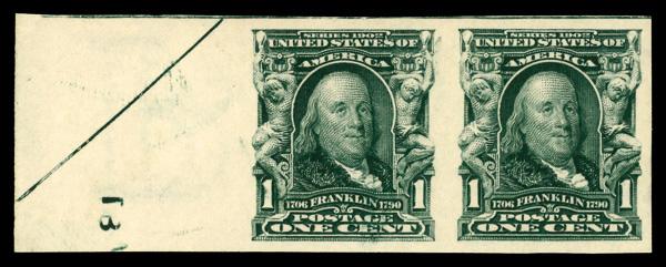 1906, 1¢ blue green, imperf. (Scott 314), left margin pair, o.g., hinged, Very Fine to Extremely Fine. Scott $28. (Image)
