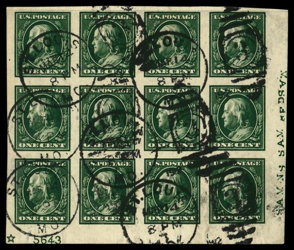 1911, 1¢ green, S.L. watermark, imperf. (Scott 383), corner margin block of 12 with plate number, Extremely Fine. Scott $33. (Image)