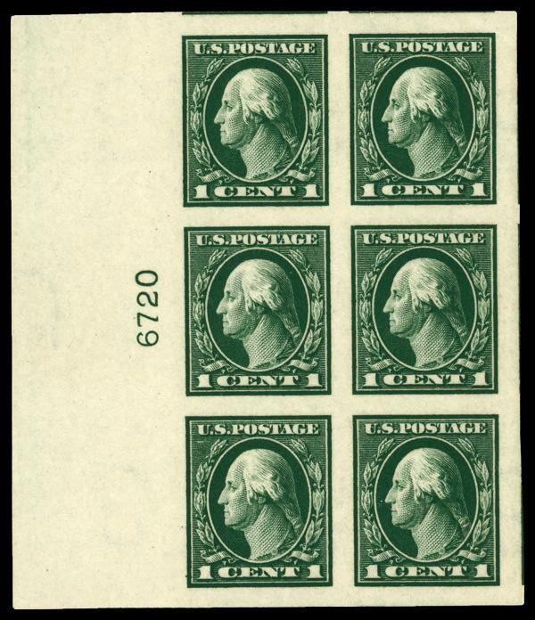 1912, 1¢ green, S.L. watermark, imperf. (Scott 408), plate block of 6, o.g., never hinged, Superb. Scott $29. (Image)