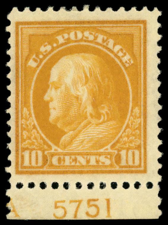 1912, 10¢ orange yellow, S.L. watermark, perf. 12 (Scott 416), plate number single, o.g., hinged, Fine to Very Fine. Scott $45. (Image)