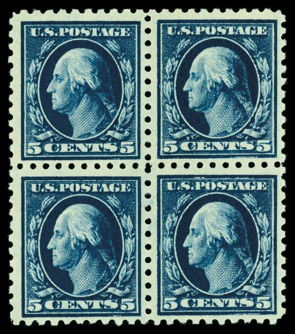 1914, 5¢ blue, S.L. watermark, perf. 10 (Scott 428), block of 4, o.g., previously hinged, Very Fine. Scott $135. (Image)