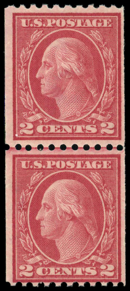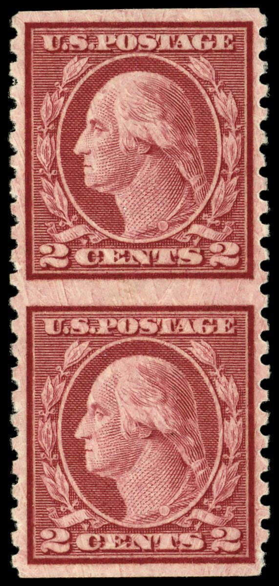 1916, 2¢ carmine, type III, S.L. watermark, vertical rotary press coil (Scott 450), joint line pair, o.g., never hinged, Fine. Scott $550. (Image)
