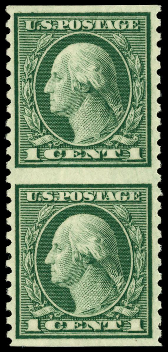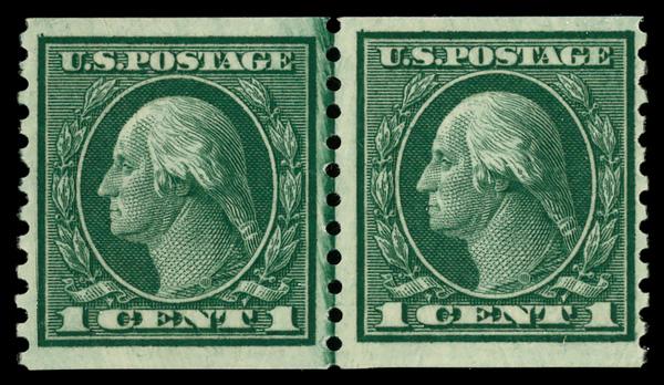 1914, 1¢ green, S.L. watermark, rotary press coil, perf. 10 vertically (Scott 452), joint line pair, o.g., hinged; small thin, Very Fine. Scott $90. (Image)