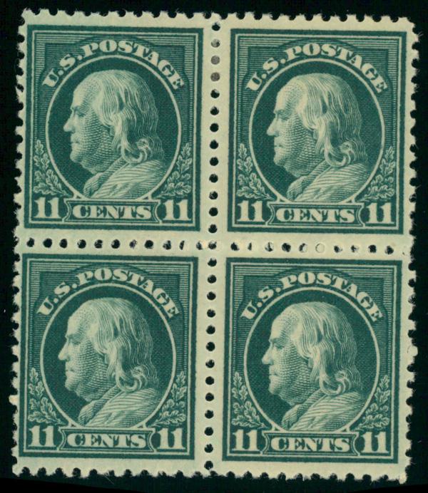 1917, 11¢ light green, perf. 11 (Scott 511), block of 4, o.g., lightly hinged (2 stamps never hinged), Fine to Very Fine. Scott $49. (Image)