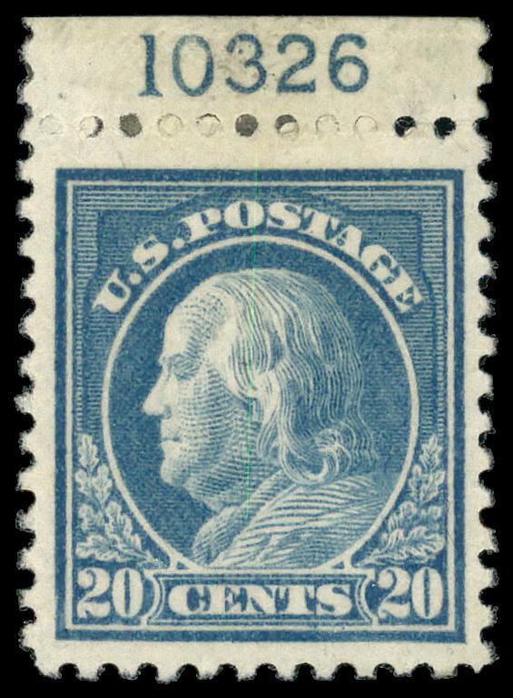 1917, 20¢ light ultramarine, perf. 11 (Scott 515), plate number single, o.g., hinge remnant, Very Fine. Scott $40. (Image)