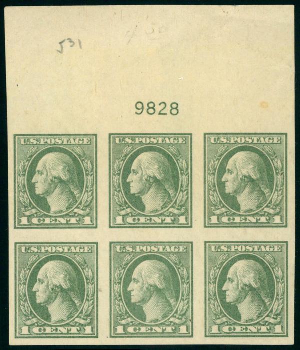 1919, 1¢ green, offset printing, imperf. (Scott 531), plate block of 6 (pencil marks & selvage creases), o.g., never hinged (gum creases), Extremely Fine. Scott $190. (Image)