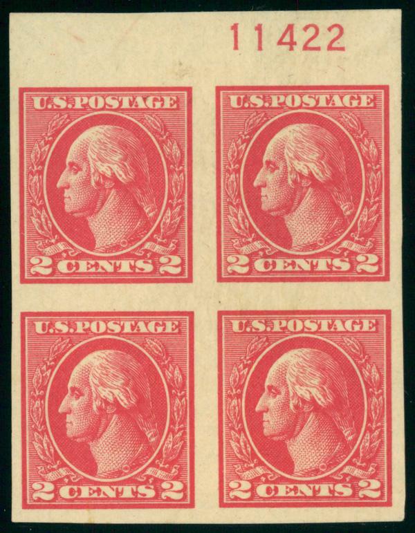 1918, 2¢ carmine, type Va, offset printing, imperf. (Scott 534), top margin block of 4 with plate number, o.g., never hinged (pencil marks on gum), Very Fine to Extremely Fine. Scott $106. (Image)