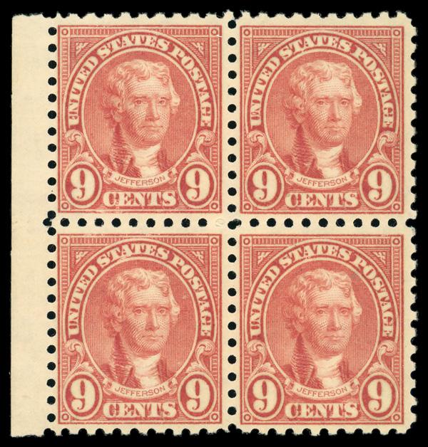 1926, 9¢ Jefferson, rotary press printing, perf. 10 (Scott 590), block of 4, o.g., lightly hinged (2 stamps never hinged), Fine to Very Fine. Scott $38. (Image)