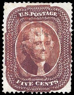 1857, 5¢ red brown, type I (Scott 28), deep shade, lightly struck red grid cancel, nicely centered; a shallow thin, otherwise Fine to Very Fine. Scott $1,175. (Image)