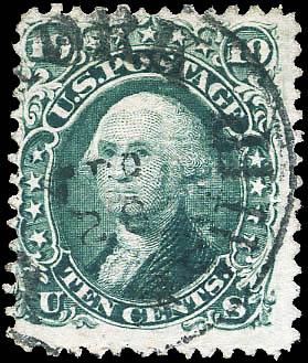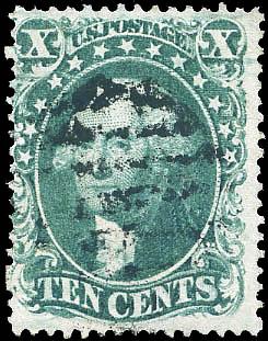 1867, 10¢ green, E. grill (Scott 89), neat c.d.s., Fine. Scott $350. (Image)