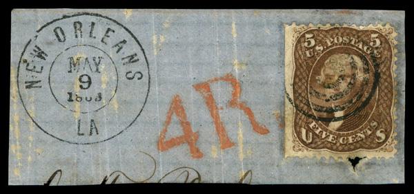 1862, 5¢ red brown (Scott 75), black grid cancel on piece, lovely bold color; tiny thin and straight edge at left, Very Good. Scott $425. (Image)